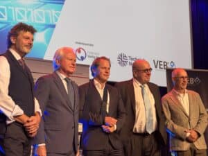 Van links naar rechts: Johan de Wit (dagvoorzitter), Boele Staal (Federatie Veilig Nederland), Gijs Tuinman (staatssecretaris Defensie), Fred Teeven (VEB) en Marc Niele (Techniek Nederland)